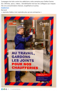 Dalkia est parmi les leaders français des solutions en énergie, filiale du groupe EDF. L’entreprise a pris les devants via une campagne assez inédite d’affichage, de quiz et de vidéo pour sensibiliser ses collaborateurs à la consommation de drogues ou d’alcool sur le lieu de travail. Cette campagne interne constitue une prise de parole engagée de la part de la Direction et des Ressources Humaines sur un sujet délicat. Pas très étonnant quand on sait que les valeurs de Dalkia sont : le respect, la solidarité et la responsabilité. L’ambition affichée « Zéro accident ».