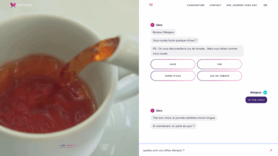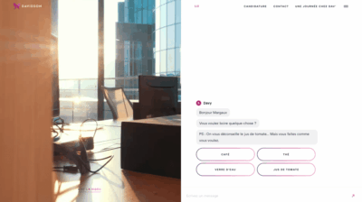 Une fois notre prénom indiqué, Davidson nous propose de l’eau, un café, un thé ou un jus de tomate. Un trait d’humour ponctue la conversation. De cette façon, il nous permet de nous projeter dans l’ambiance régnante au sein de l’entreprise.